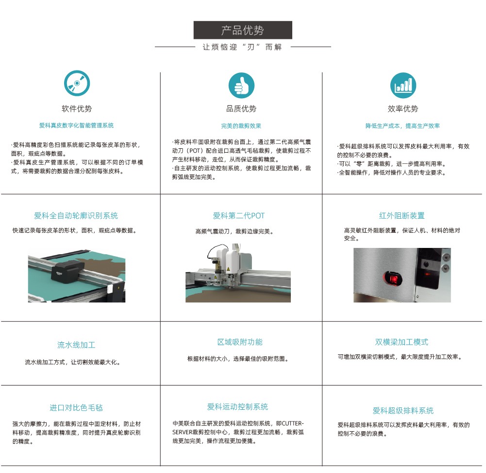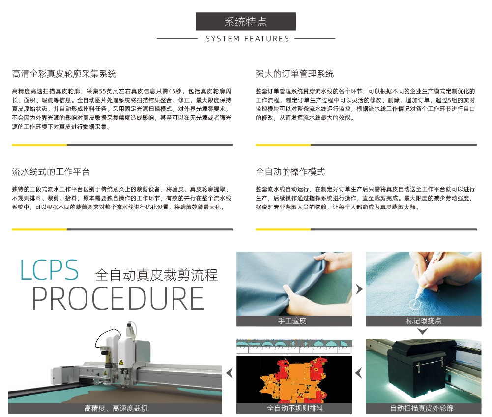 LCPS真皮裁剪流水線系統(tǒng)采用高清全彩真皮輪廓采集系統(tǒng),通過掃描提取真皮不規(guī)則輪廓形狀、面積、瑕疵等信息,配合全自動排料系統(tǒng),產(chǎn)生優(yōu)化的裁剪方案,三段式流水工作平臺,發(fā)揮裁...