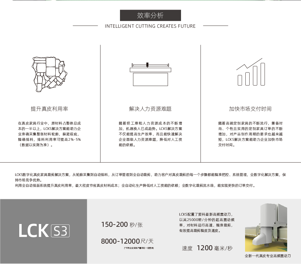 LCKS數(shù)字化真皮家具裁剪解決方案,從輪廓采集到自動(dòng)排料,從訂單管理到全自動(dòng)裁剪,助力客戶對(duì)真皮裁剪的每一個(gè)步驟都能精準(zhǔn)把控、系統(tǒng)管理,全數(shù)字化解決方案,保持市場(chǎng)競(jìng)爭優(yōu)勢(shì)。...