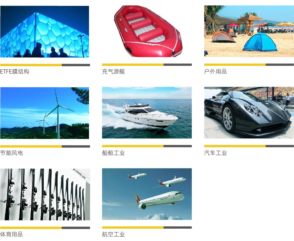 適用行業(yè):復(fù)合材料、家具內(nèi)飾、汽車內(nèi)飾、氣模制品、紡織服裝、膜結(jié)構(gòu)、充氣游艇、戶外用品、節(jié)能風(fēng)電、船舶工業(yè)、體育用品、航空航天